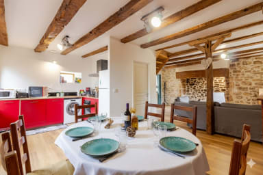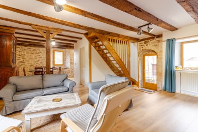 The living area is warm and inviting. The authentic character of the house has been carefully preserved, with a beautiful blend of stone walls, wood, a fireplace, and exposed beams, creating a charming and welcoming atmosphere.