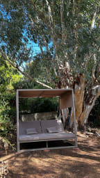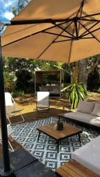 An outdoor shower awaits you after a day at the beach. Enjoy the laid-back lifestyle on a large 950m² plot with two terraces where you can unwind in the shade or the sun. Garden furniture and a 2m x 2m Balinese bed are at your disposal for relaxing, listening to the cicadas, and reading.