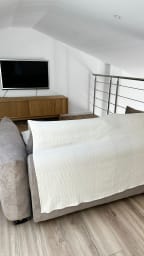 On the ground floor, you'll find two bedrooms and a walk-in shower. Upstairs, there's a bedroom with an en-suite shower room, a relaxation room, and two alcove beds. The most surprising feature is a Japanese toilet – a must-try!