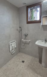 Au rez-de-chaussée : une cuisine ouverte -salon- salle à manger, une chambre (3 lits 90 cm) et une salle d’eau avec wc séparé.