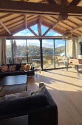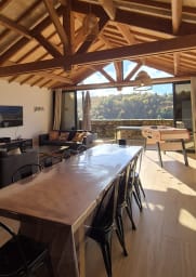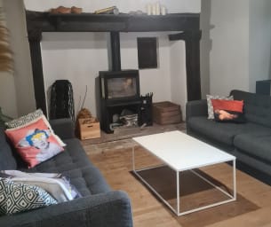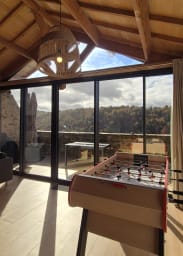 Une seconde aile plus moderne, avec un très grand séjour, TV Chromecast, babyfoot, et une cuisine équipée ouverte.